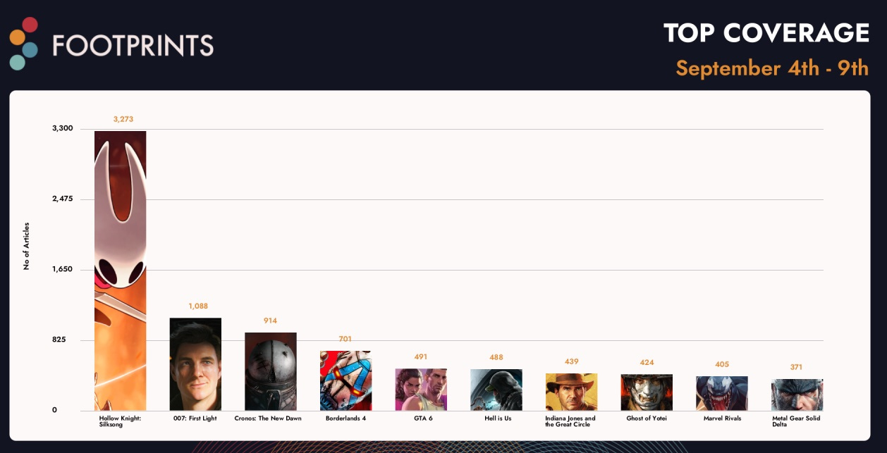 Footprints.gg’s latest weekly ‘trad media’ game mentions chart sees Silksong outpacing other titles by 3x, followed by Bond game 007: First Light getting pre-orders & hype, as well as Cronos: The New Dawn (just released!), Borderlands 4 (released after the end of this period), and more…