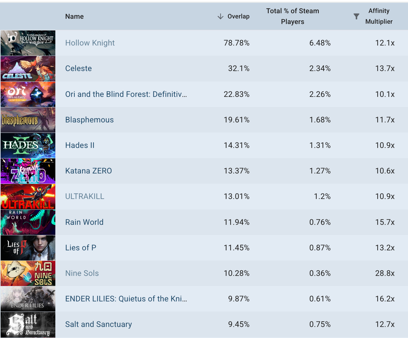 Using our GameDiscoverCo Pro data site (which provides all the data in this analysis), we looked specifically at the ‘highest overlap’ games played by Hollow Knight: Silksong that had >10x Affinity (i.e. were >10 times more likely to have been played by Silksong players than the average Steam player.)