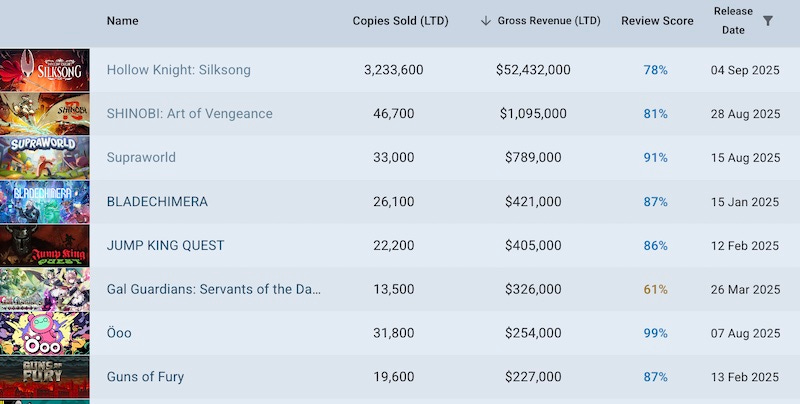 And that’s our data review so far. Our biggest takeaway? Think of Silksong’s success more as a ‘rabid 20-30 million person fanbase gets to enjoy a long-awaited sequel’ than a success that can be analyzed in context with most new releases…