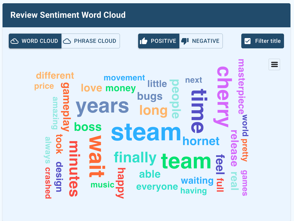 We know people have been waiting for this game for a long time - and our ‘word cloud from common words in positive, helpfully rated Steam reviews’ for Silksong (above) is littered with things like ‘finally’, ‘wait’, ‘years’, and ‘happy’ (aww!)