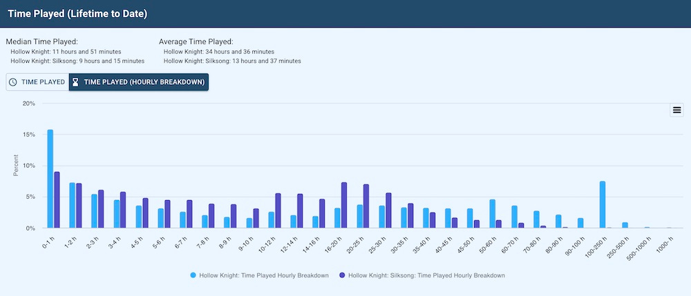 But for now, we can still compare the Steam play time of the OG Hollow Knight to its sequel, and discover that surprisingly, median play time isn’t that different right now. (Hollow Knight: 11 hours and 51 minutes, and Silksong: 9 hours and 15 minutes.)