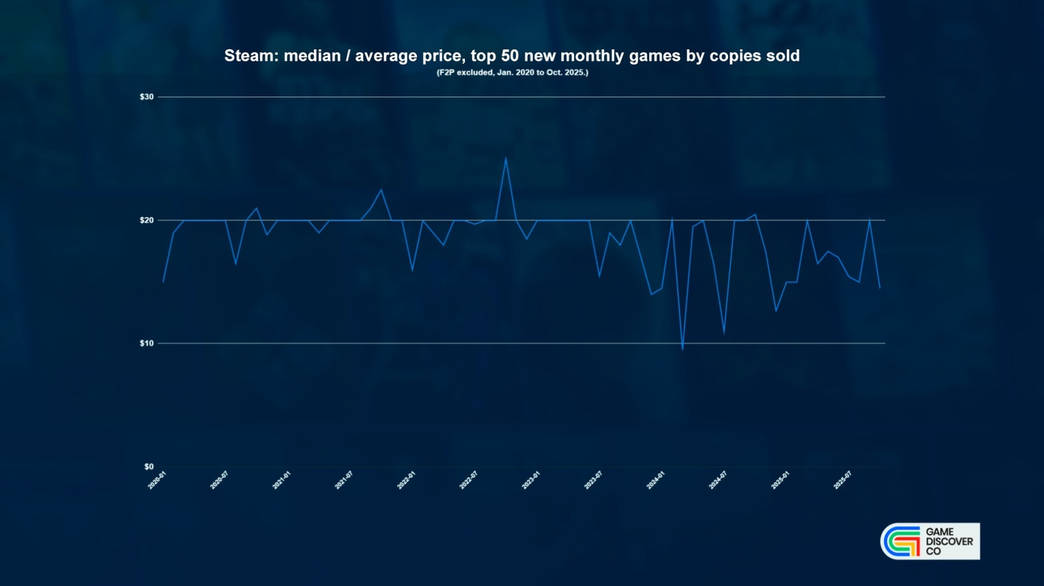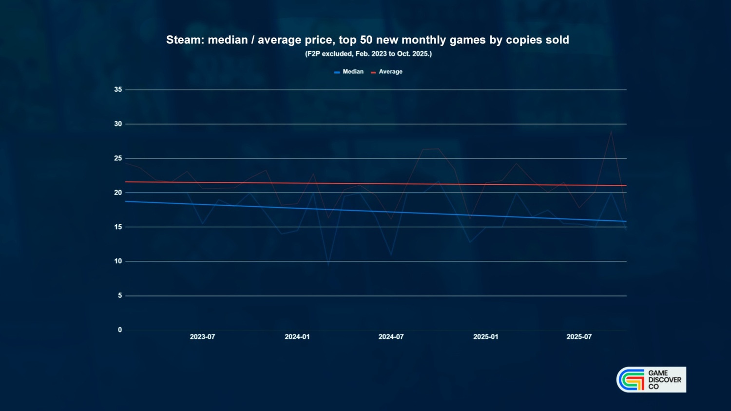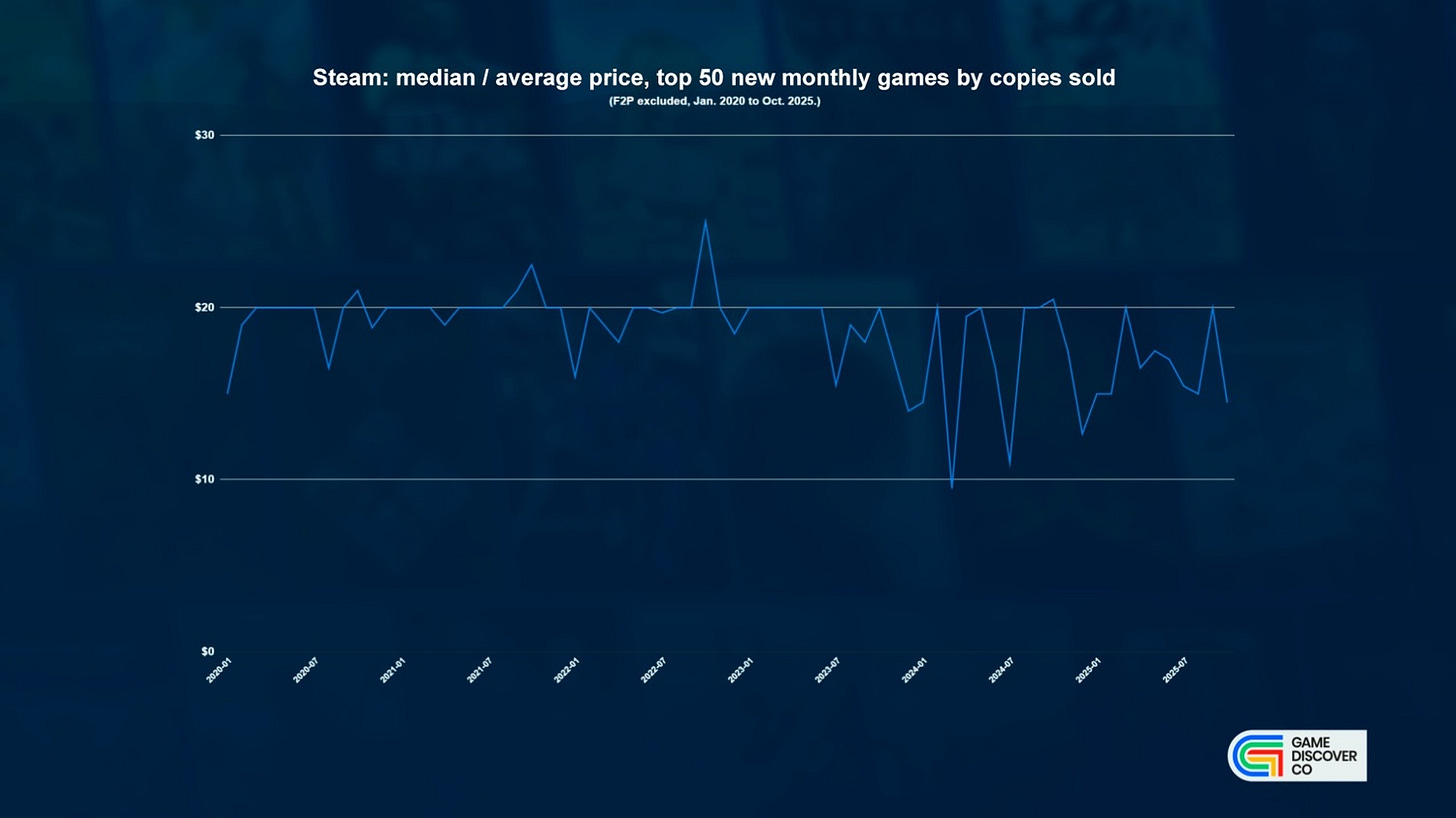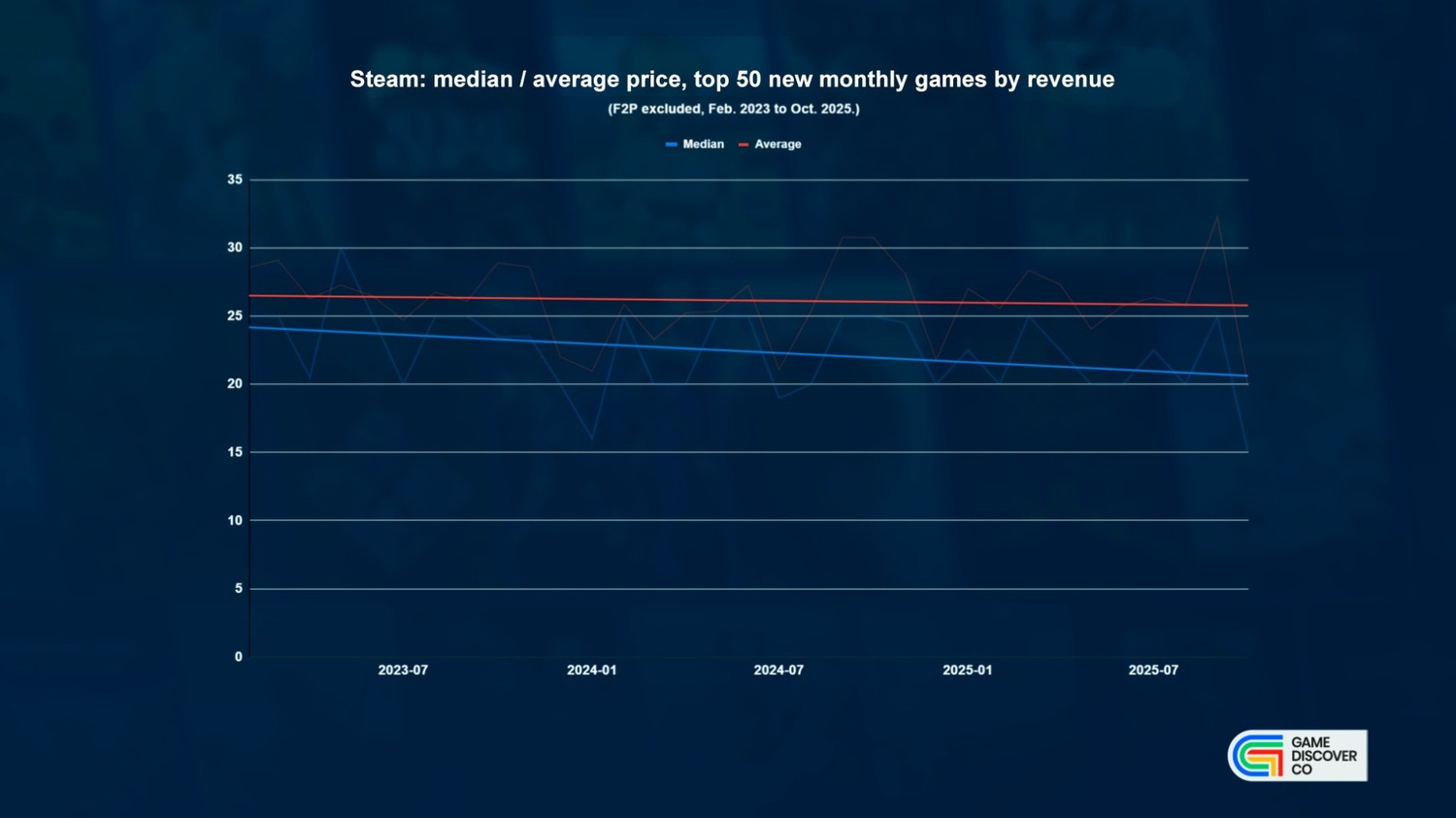 The average Steam Top 50 (by launch revenue) game price starts at $26.20 (Feb. 2023) and ends at $25.76 (Oct. 2025), down 2%.