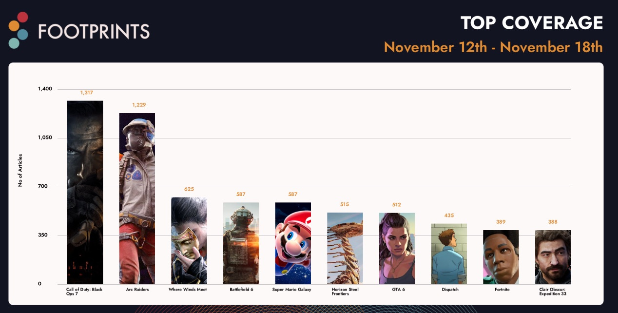 The latest Footprints.gg ‘trad media’ charts (from ICO) has Call Of Duty: Black Ops 7 (which had a mediocre CCU surge on Steam release) duking it out with Arc Raiders (which is still going great!) They’re followed by Wuxia F2P standout Where Winds Meet, the still-buzzin’ Battlefield 6, and more…