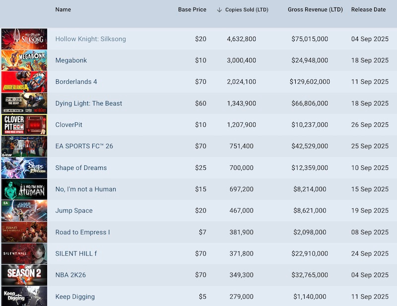 What are you noticing - admittedly with anecdotal skew, since it’s just one month? Well, we spot a lot of $60-$70 games (Borderlands 4, Dying Light: The Beast), a chunk of $5-$10 titles (Megabonk, CloverPit, Keep Digging) and some $15-$20 games (No, I’m Not A Human, Silksong, Jump Space), with relatively little priced at $25-$55 as default.