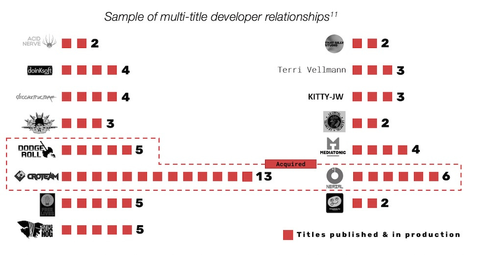 And luckily, the excess profit generated by Fall Guys - $70 million in 2020 alone - allowed the company to buy Croteam (Serious Sam), Nerial (Reigns), Firefly Studios (Stronghold) and Dodge Roll (Enter The Gungeon) - as well as publisher Good Shepherd. Which leads to the above figure, showing the company’s multi-title franchises, and which can be classed ‘own IP’*.