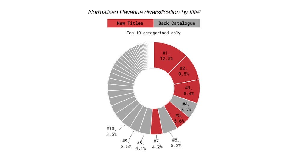 In recent years, at least 60% of Devolver’s revenue has been from games released in previous years, even though they don’t push IAP particularly hard in their games. So a lot of this is catalog sales, discounts, new DLC that sells the main game..