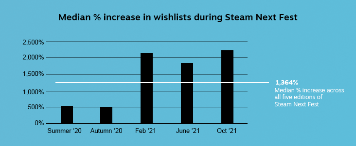 Wishlists made during the Fest still converted: “The median released game saw an increase of 500% in "converting wishlists" made during Next Fest compared to converting wishlist additions made in the two weeks leading to Next Fest.”
