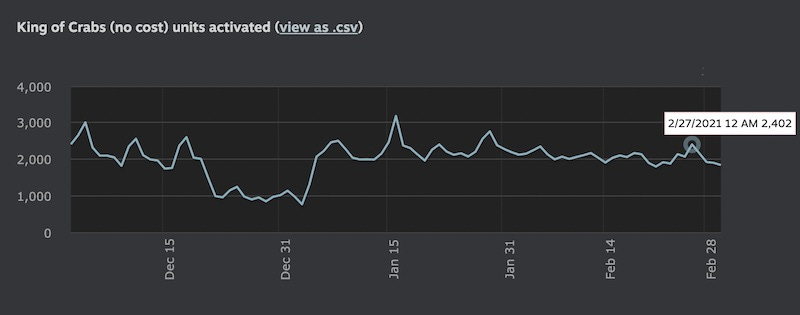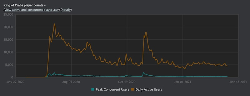 Next, let’s look at player count for King Of Crabs. Steam reveals that the average daily active users for the game on Steam is 7,284, and the all-time maximum was 21,383. Here’s the player count graph over time, showing daily active users steady at around 5,000 in recent weeks: