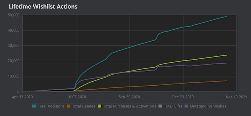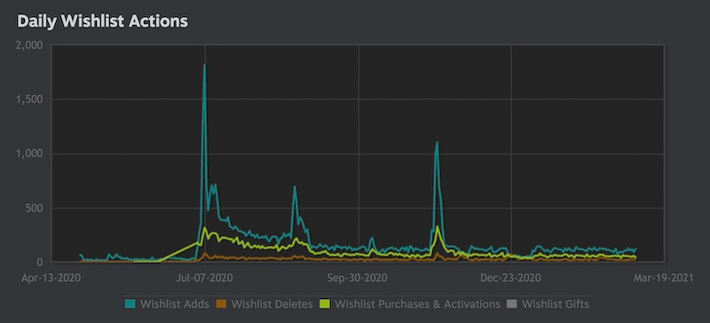 Finally, here’s the daily wishlist actions graph. You can see those previously discussed spikes in July and November showing up. Plus, you can spot that almost complete lack of wishlist additions in the Winter Sale: