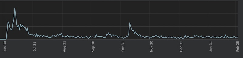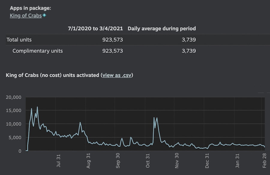 Next up, let’s look at the curve of downloads of the free King Of Crabs Steam client, in the few months since it’s been out. Obviously, as with all games, it’s had a tail after release. (Hence the average of 3,700 downloads per day.)