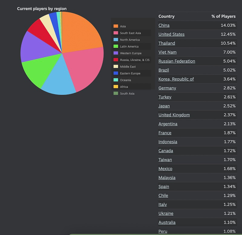 Paid games also often have the U.S. and China leading the pack, but then include Germany, France, the UK, Canada and Australia way higher up the list. (And you certainly would almost never see Thailand and Vietnam in the Top 5 paid Steam game countries.)