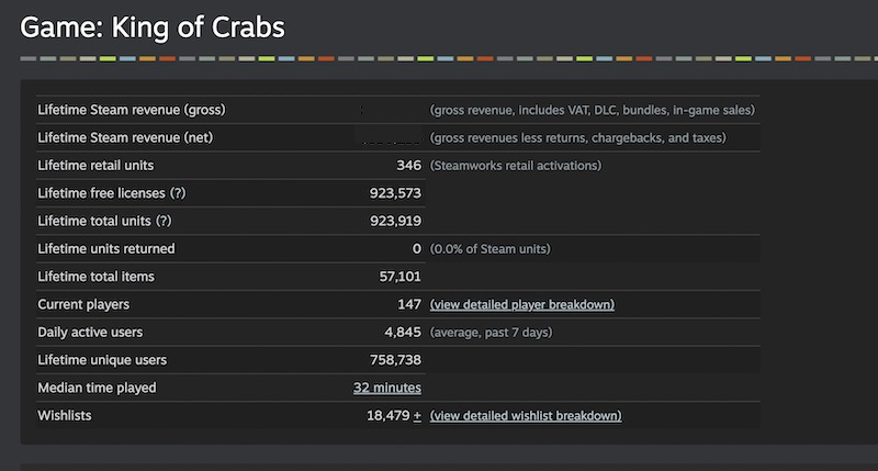 The title in question is multiplayer ‘crab battle royale’ game King Of Crabs, which has an impressive 4,900 Steam reviews at 79% Positive. Thanks to Robot Squid’s Chris Dawson and Spilt Milk’s Andrew Smith for being willing to share. So let’s get to it!