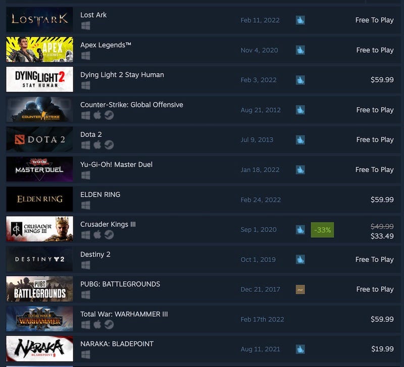 When you see DLC high up in the Steam chart, such as Crusader Kings III: Royal Court, currently #13 in the ‘app-specific’ ranking, you’ll sometimes see the full game a bit higher up in the ‘combined’ chart. (CK3 is #8 in that chart right now.) But that’s partly because 4 versions of Lost Ark in the app-specific ranking get merged down to 1 in combined. So not necessary a big change.