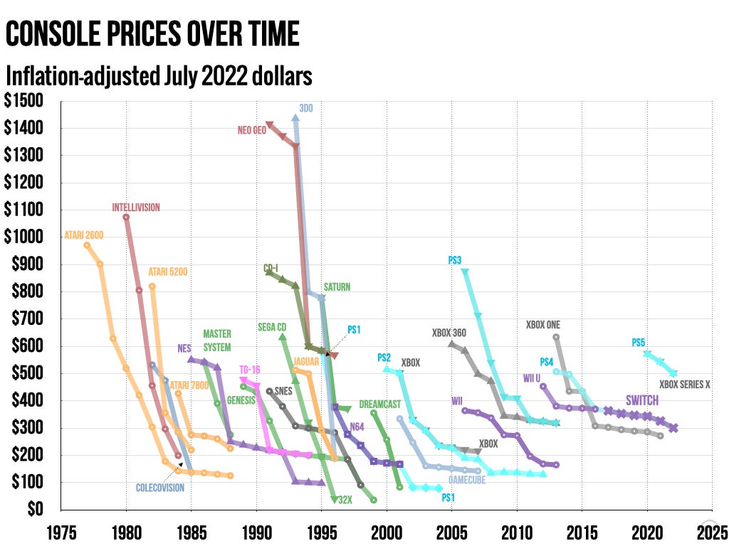 Inflation-adjusted prices for every game console since the late ‘70s? Bring it on, Ars Technica! The graph (above) is from an article asking whether Nintendo Switch will ever cut its price in real terms. To which the answer seems to be ‘not right now, people still like it too much!’