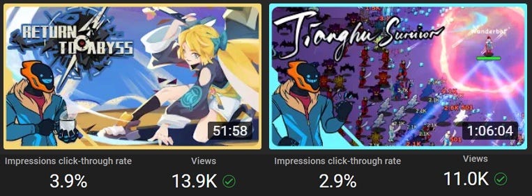 There’s a real-world example where better assets = more views: as shown above using YouTube back-end data, Wanderbot’s Return To Abyss video got a 3.9% ‘impressions to clickthrough’ rate on YouTube, compared to 2.9% for Jianghu Survivor’s video. Both are Chinese made Vampire Survivors-likes, and we agree, Return To Abyss just looks nicer, due to the stylish key art.