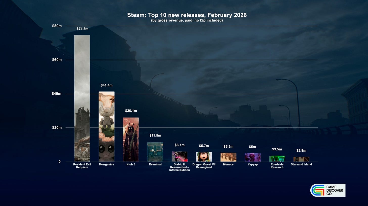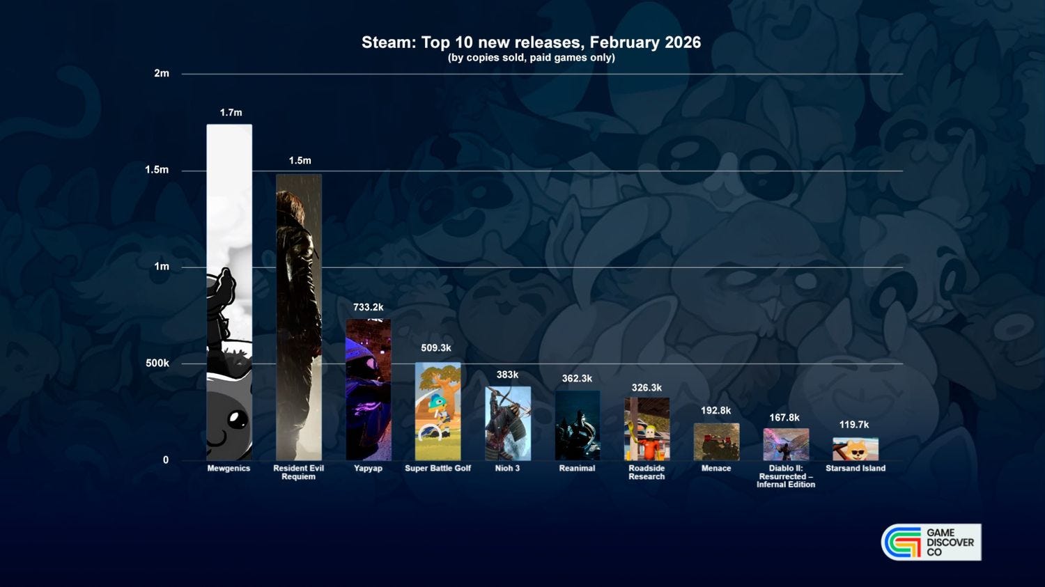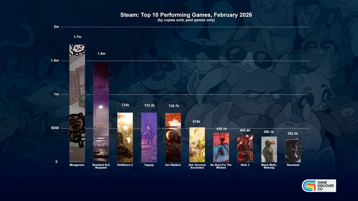 Mewgenics made the top spot in our charts with 1.7m units: it’s a close call between it and Res Evil Requiem, but in our charts, “bizarre cat-breeding simulator” Mewgenics ($30) - which we did a full newsletter on already - is the top new Steam game of Feb. 2026. (Median time played is already ~13 hours, average >23!)