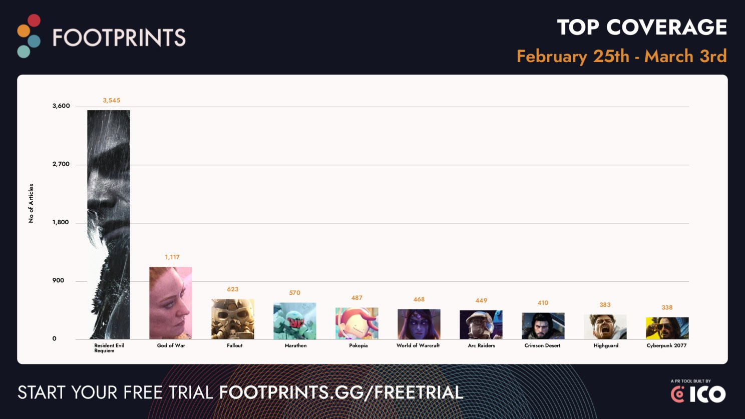 The latest Footprints.gg estimates on weekly ‘trad media’ mentions show Resident Evil Requiem - which already hit 5 million copies sold, per Capcom, #1 by far. Also hot: transmedia franchises God Of War & Fallout, as well as Pokemon life sim Pokopia (Switch 2 exclusive, Dragon Quest Builders 2 co-devs, a lotta hype.)