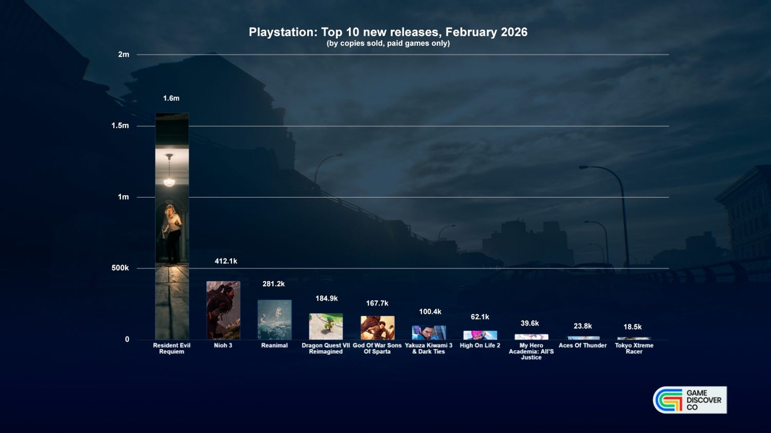 Also in this chart: Nioh 3 approaching 500k sold, and co-op horror game Reanimal (which also sold decently on Steam!) at nearly 300k, with Dragon Quest VII remake and the God Of War 2D pixel art ‘surprise drop’ between 150k and 200k units so far. Over-the-top sequel High On Life 2 managed 100k between PlayStation and Steam.