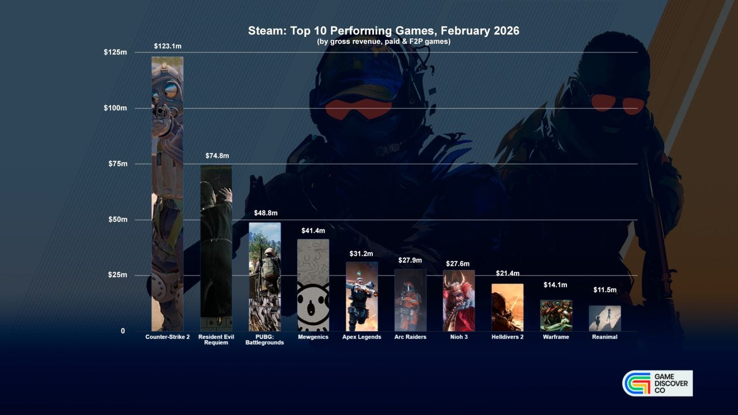 Our revenue estimates across all Steam games in Feb. 2026 (including F2P titles) shows Counter-Strike 2 predictably hanging out at #1, with good months from PUBG (#3, thanks to Spring Fest), Apex Legends (#5, thanks to a new Breach update), and more.