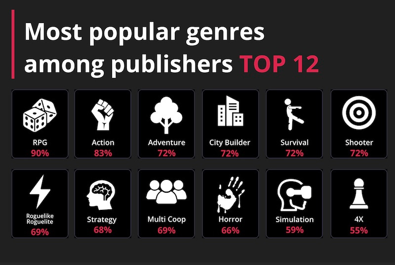 City-builders, survival games, roguelites & co-op top the ‘most wanted’: the above graphic shows some of the top publisher-desired genres. We’re not surprised to see city builder (72% of all publishers), survival games (72%), roguelike/lites (69%), co-op games (69%) and horror titles (66%) top the subgenre-specific rankings.
