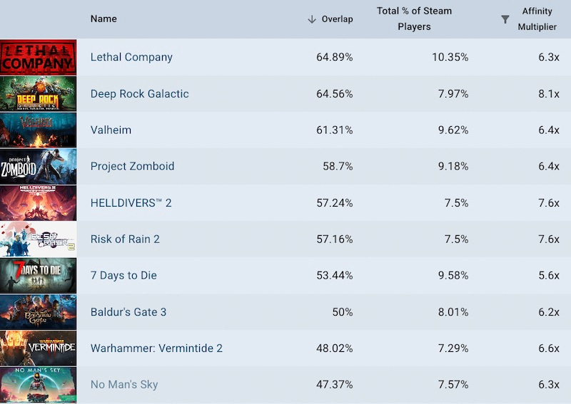 For more context on player influences & overlap, here’s some GameDiscoverCo Pro data showing the % of Abiotic Factor players who own a certain game on Steam, and how much more likely they are to do so than the average player (‘Affinity Multiplier’):
