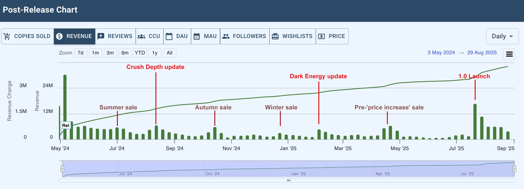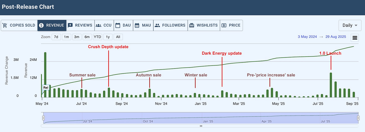 As the game’s Steam sales evolved from 600k from May-Aug. 2024 to 1.4m by the end of Aug. 2025 - with an all-time high Steam CCU of 29,000 at 1.0 launch - it’d be great to view the ‘long tail’ effect & how discounts and updates help. So here’s a GDCo-estimated revenue chart, using our GameDiscoverCo Pro data:
