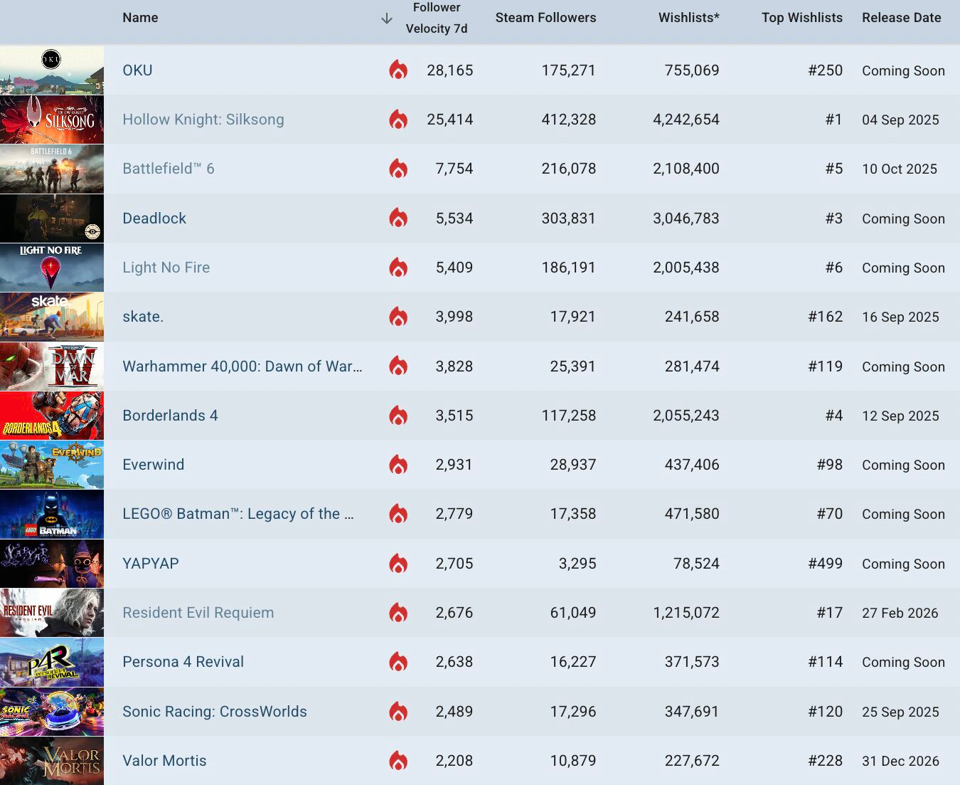 Looking at GDCo's analysis of 'trending' unreleased Steam games by 7-day new follower velocity (above) - ignoring the incented OKU (#1), Hollow Knight: Silksong (#2) is surging ahead of its much-vaunted release later this week. And Battlefield 6 (#3) continues to rack up both followers and pre-orders.