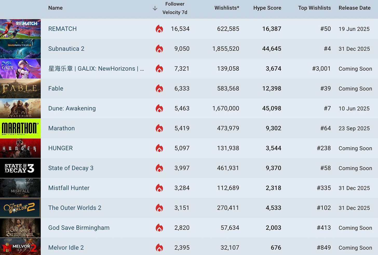 Checking out GameDiscoverCo's countdown of 'trending' unreleased Steam games from April 21st to 28th, Soccer PvP standout Rematch is #1 yet again, and Subnautica 2 is up to #2, thanks to a 'Road To Early Access' Vlog. Fable (#4) & State Of Decay 3 (#8) were boosted thanks to an Xbox Publisher Sale takeover on Steam.
