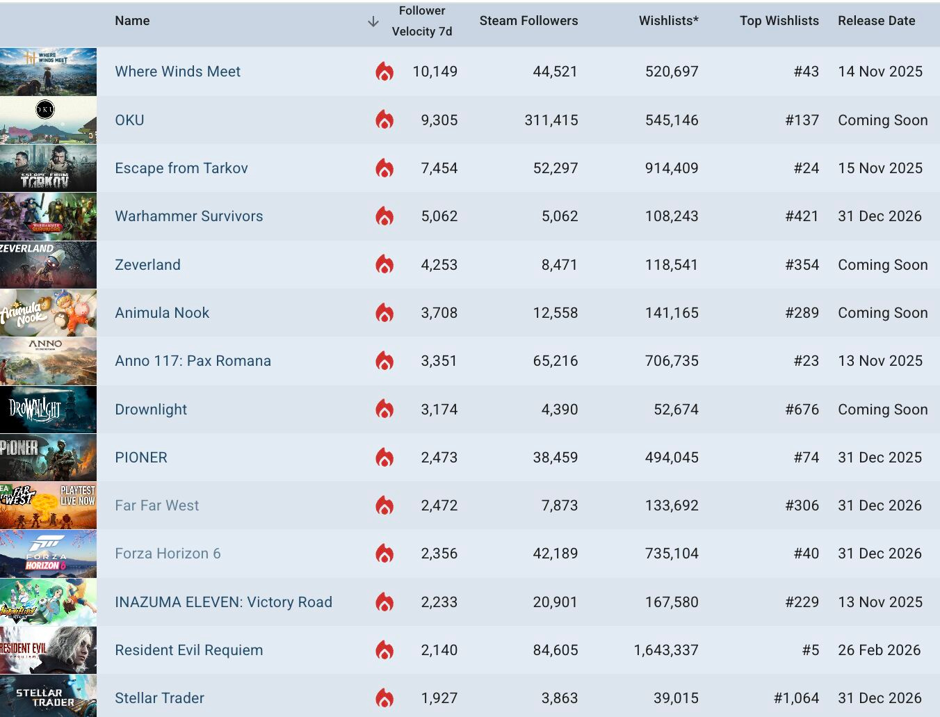 Checking GDCo’s ‘7-day trending’ unreleased Steam game follower chart (Nov 3rd to 10th): ahead of their release this week, Wuxia ARPG Where Winds Meet (#1), and the ‘long available off-Steam’ extraction shooter Escape From Tarkov (#3) both got significantly boosted in trending, each making it over 500k wishlists.