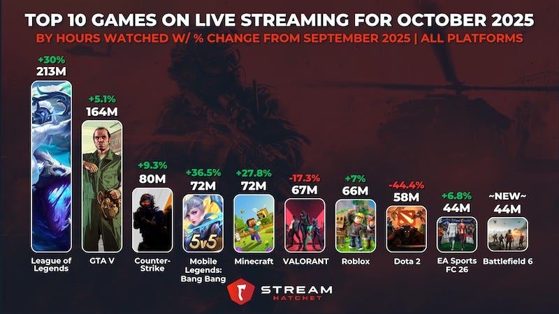 To end - yes, livestream analytics platform Stream Hatchet is again helping us look at the Top 100 most-streamed games from October 2025, analyzing the big (non-China) game video streaming platforms like Twitch & friends.