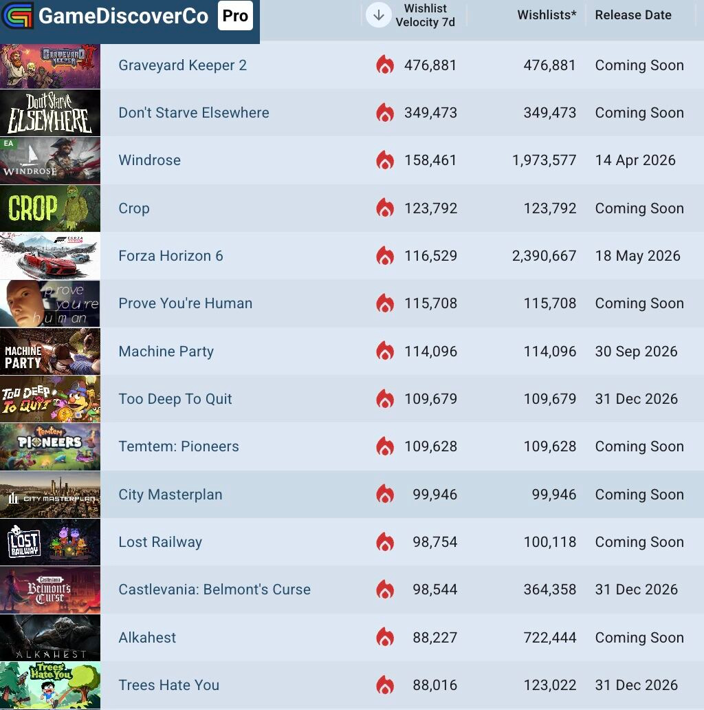 As we noted in GDCo’s latest ‘trending unreleased Steam games’ by 7-day wishlists chart (above), the Triple I Initiative showcase made for a busy time: buoyed by a giveaway on the original, Graveyard Keeper 2 is at #1, shortly followed by Don't Starve Elsewhere (#2), continuing Klei's hit spooky survival series.