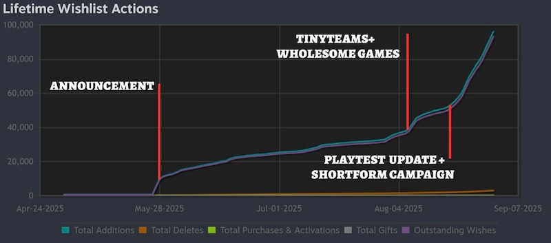 There was a big step-up in August due to a co-ordinated campaign: the game was in a Wholesome Games showcase & the Tiny Teams Steam sale, also updated the playtest version, and added paid shortform video campaigns around then too, targeting the majority female audience Tinybuild believed were the target.