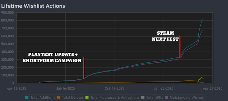 Following the August inflection point, the game gained 1.3k average daily wishlists (whoa!) all the way up to its big public demo showcase in Feb 2026’s Next Fest, where it added 74k wishlists and then kept increased momentum until launch: