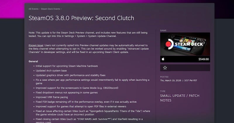 Valve’s latest SteamOS 3.8.0 preview is here, and as The Verge notes: “Valve is adding genuine hibernation and ‘memory power down’ modes to the Steam Deck — though just the LCD model to start”, and Steam Machine and “lots of support for Xbox Ally, Legion Go 2” and others is also added. (Lots of forward momentum here.)