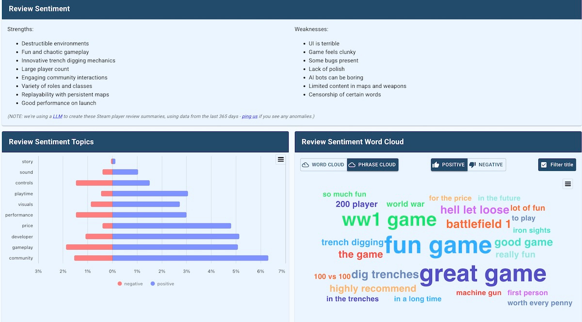There’s also a more unique mechanic in the mix - trench digging: you’ll see it called out in the below Steam player review sentiment analysis, but Schmid stresses the “the most obvious feature of Over The Top is digging trenches and building fortifications on the map.” And people teaming up to dig trenches does feel neat!