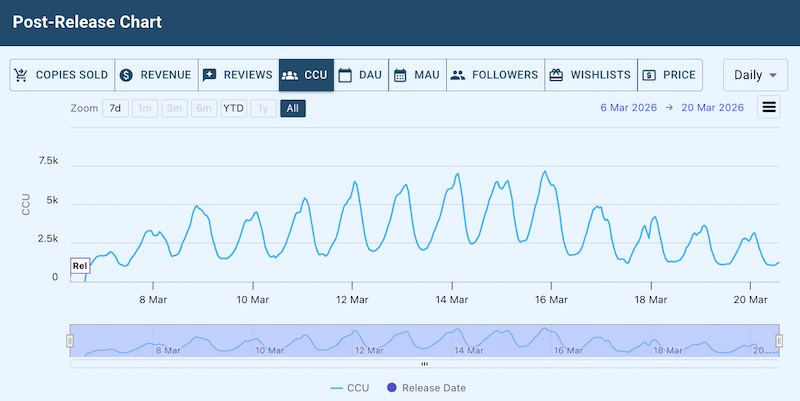 The game - created by 4-man dev (!) Flying Squirrel Entertainment and published by GG Publishing, also had an interesting ‘rising curve’ on Steam concurrents, maxing out so far at 7,000 CCU about 8 days after release, per GDCo Pro data: