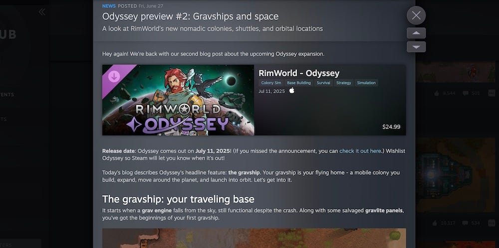 This is one reason why GameDiscoverCo doesn’t do endless exec interviews or scuttlebutt - there are plenty of direct-to-market winners in games who a) made a great game b) stuck with it, and c) built a franchise. And Ludeon Studios’ sci-fi colony sim RimWorld is an amazing example of that.