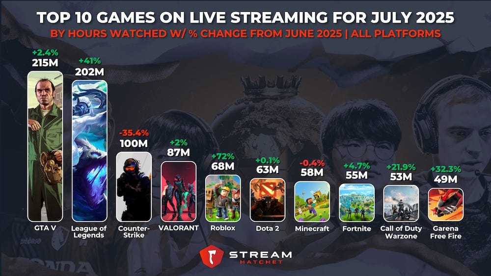 Roblox hit #5 with 68m, after a 72% growth in hours watched: this further shows the Grow a Garden user surge wasn't a flash-in-the-pan phenomenon. (There’s a whole host of different games contained within this ‘game’ listing, of course, and StreamHatchet also tried to separate GaG out - it’s at #42 with 9.98m hours.)