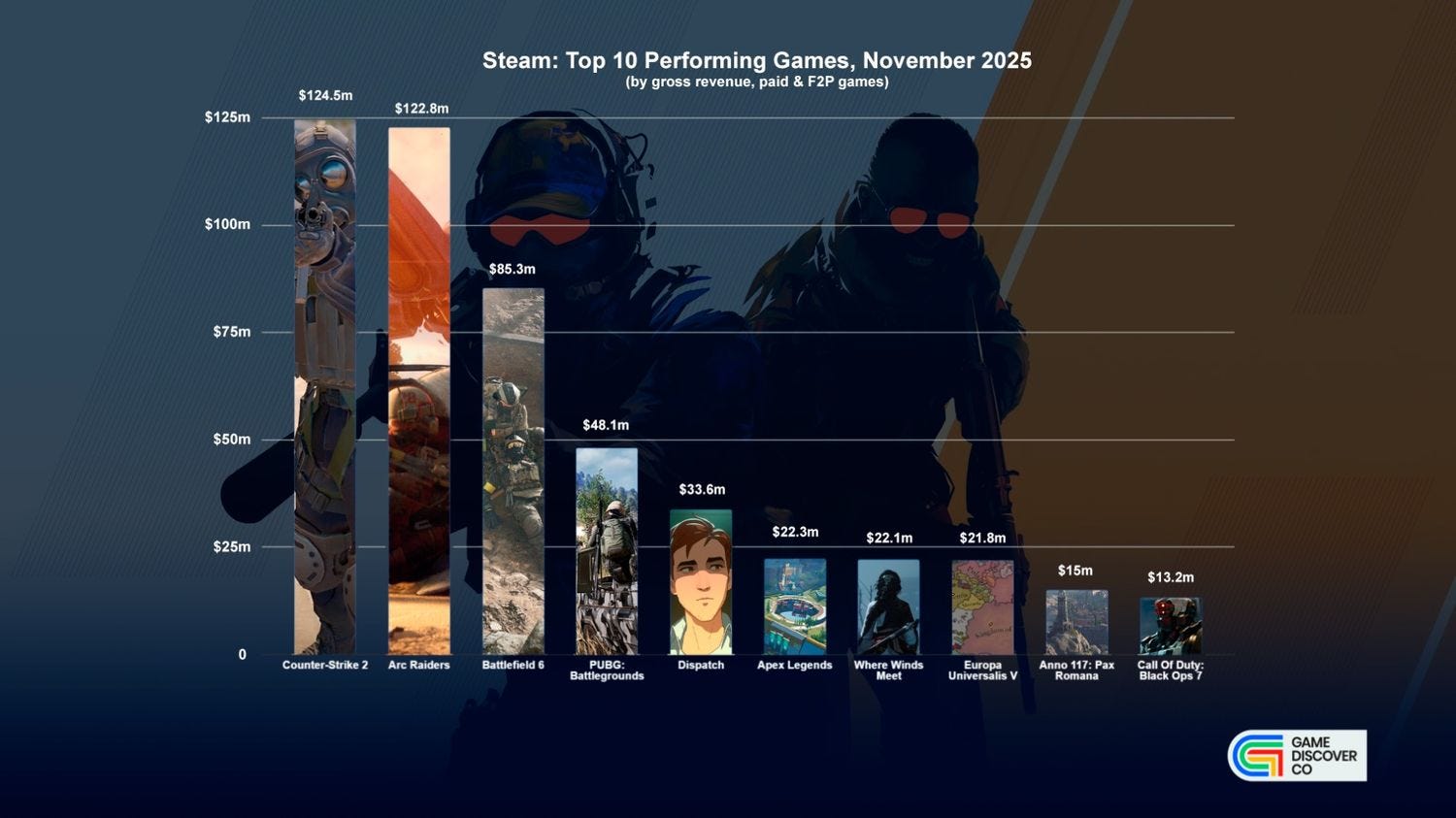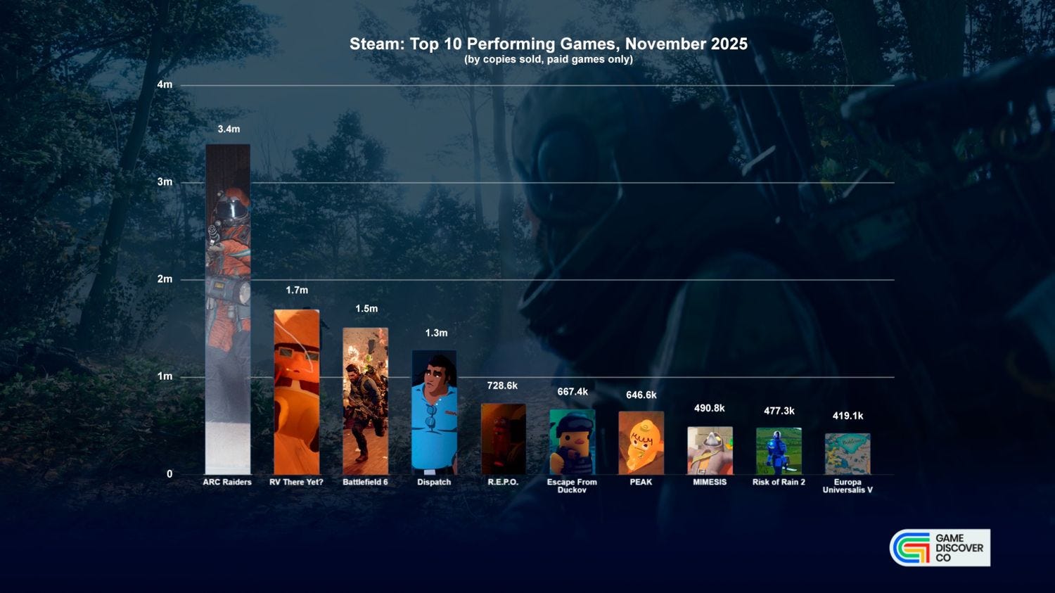 ARC Raiders and Battlefield 6 are the big 2025 winners in the shooter wars: Extraction shooter standout ARC Raiders added 3.4m copies to hit ~5 million on Steam (and 2m on PlayStation and 1.5m on Xbox), and Battlefield 6 adds 1.5m (and has 9.6m Steam, 5.2m Xbox and 9.5m PlayStation, for an insane 24+ million.)