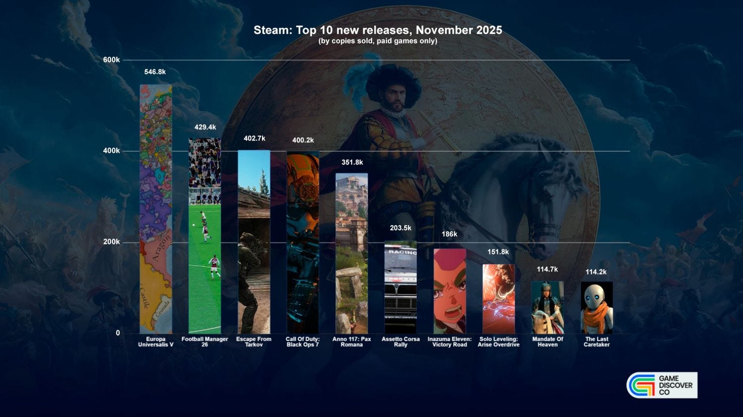 Two deep, hardcore strategy games performed well in Nov: both Paradox’s Europa Universalis V (#1, 547k units) and Ubisoft’s Anno 117: Pax Romana (#5, 352k units) are deep, expensive, incredibly complex games. And they did good - not giiiant, but very competently, and EU V in particular should have a long life.