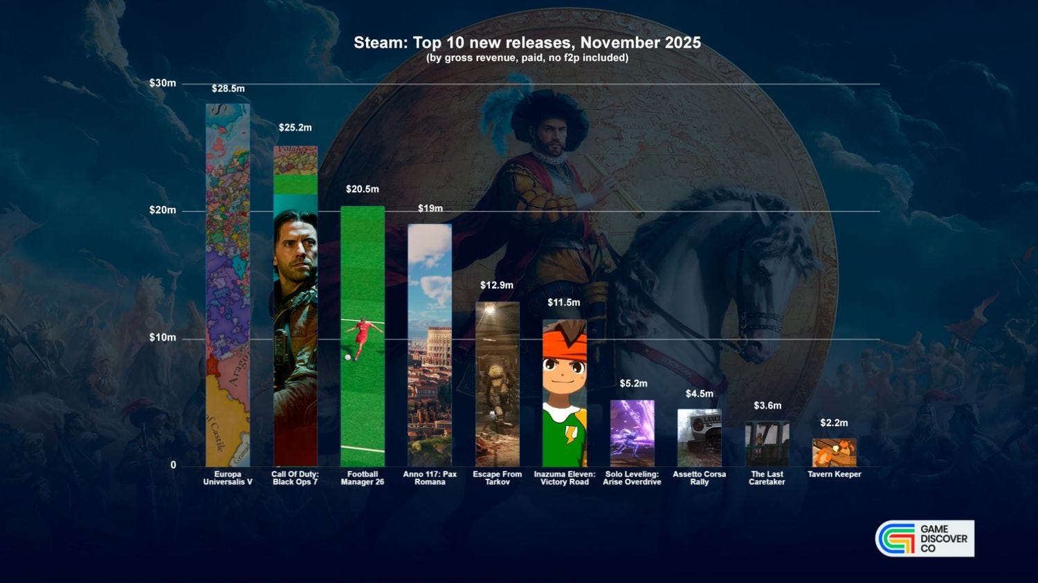 Next, let’s peruse the Top 10 new Steam releases by revenue (above). Actually, since quite a few of these games were $60-$70, this chart holds up a bit better compared to October - at least down to soccer RPG Inazuma Eleven: Victory Road. (Below that, it dips a long way - we have the #10 game at ‘only’ $2.2m gross.)