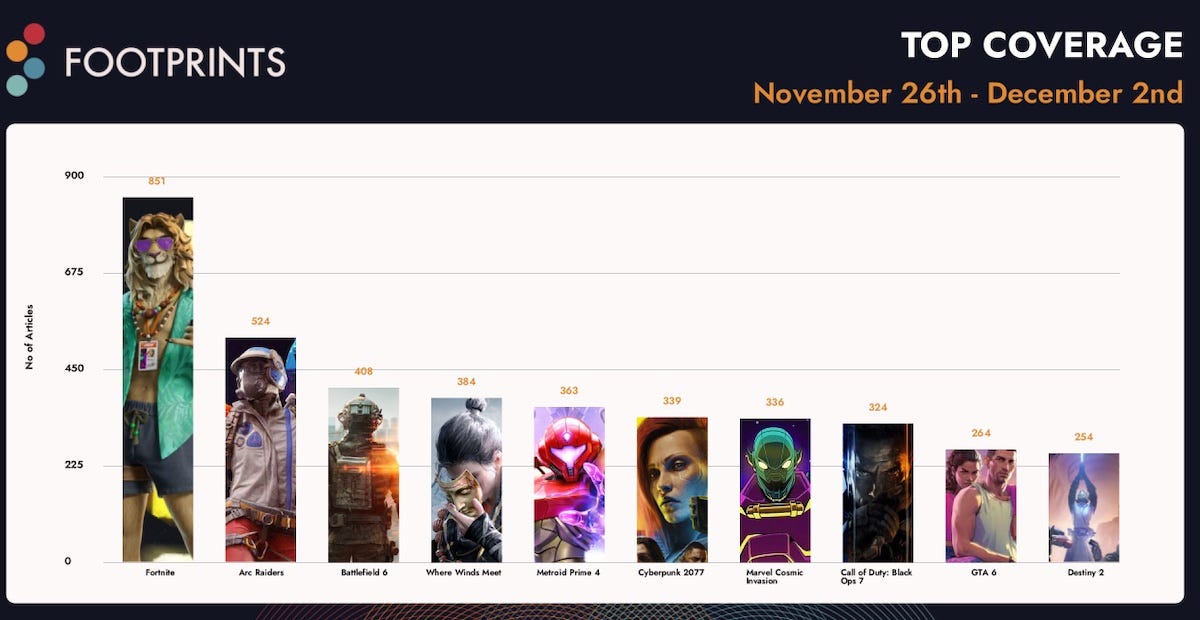 The latest Footprints.gg ‘trad media’ charts (from ICO) sees Fortnite atop the media mentions chart, as the Zero Hour live event hit 10.5m CCU. Also hot? ARC Raiders and Battlefield 6, of course, but also Wuxia RPG Where Winds Meet, which is Top 20 grossing on Steam right now, even tho it’s 1am China time.
