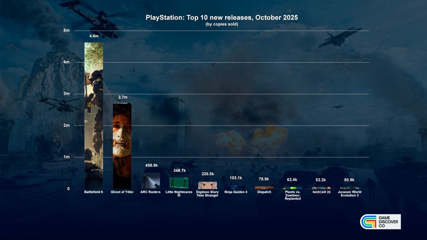 There’s no surprise here that Battlefield 6 is #1 with a bullet - we have it at 4.6m units sold in Oct. (and over 12m units across Steam, PS, and Xbox.) But Sucker Punch & PlayStation’s console-first samurai adventure sequel Ghost Of Yotei is faring great too at #2, with 2.7m units. (13% of those are in China and 5% in Japan, with 34% in the U.S.)