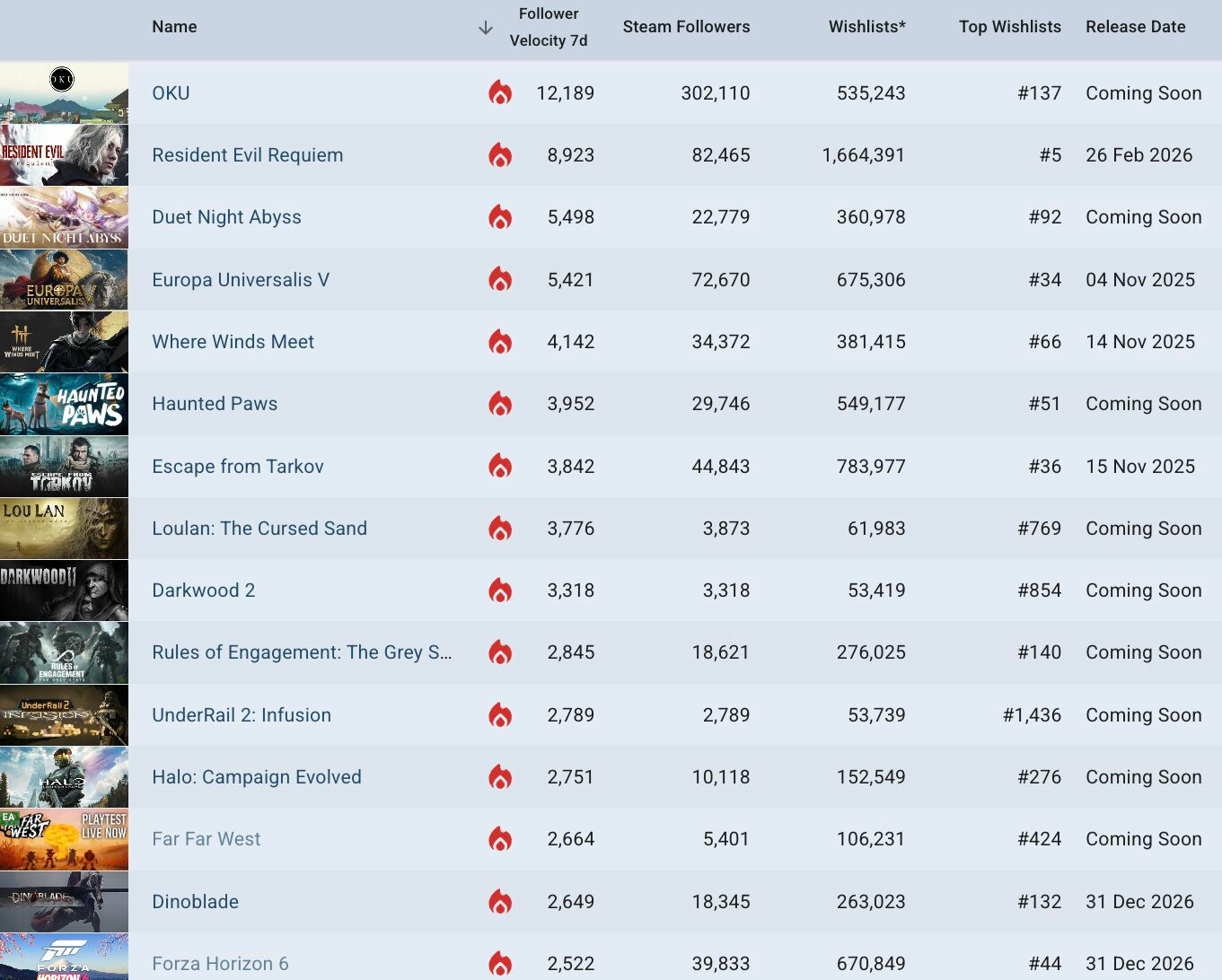 Checking GDCo’s ‘7-day trending’ unreleased Steam game follower chart (Oct 28th to Nov 3rd), Resident Evil Requiem (#2) got a big boost, since pre-orders opened for Capcom’s horror sequel. And Duet Night Abyss (#3) is a F2P mobile/PC gacha ARPG which just launched PC client-only, but skipped a Steam release for now.