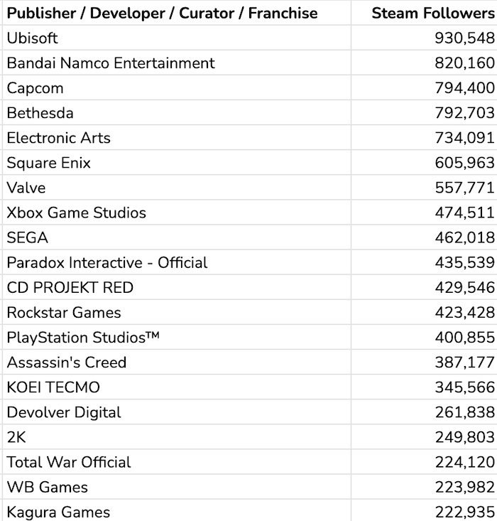 Results are somewhat as expected. There’s some franchises in the Top 20 in addition to publishers - Assassin’s Creed (which isn’t even actively publishing on Steam right now!) and Total War. And maybe the adult RPG/visual novel creator Kagura Games being in this list is a little surprising? But, smut…