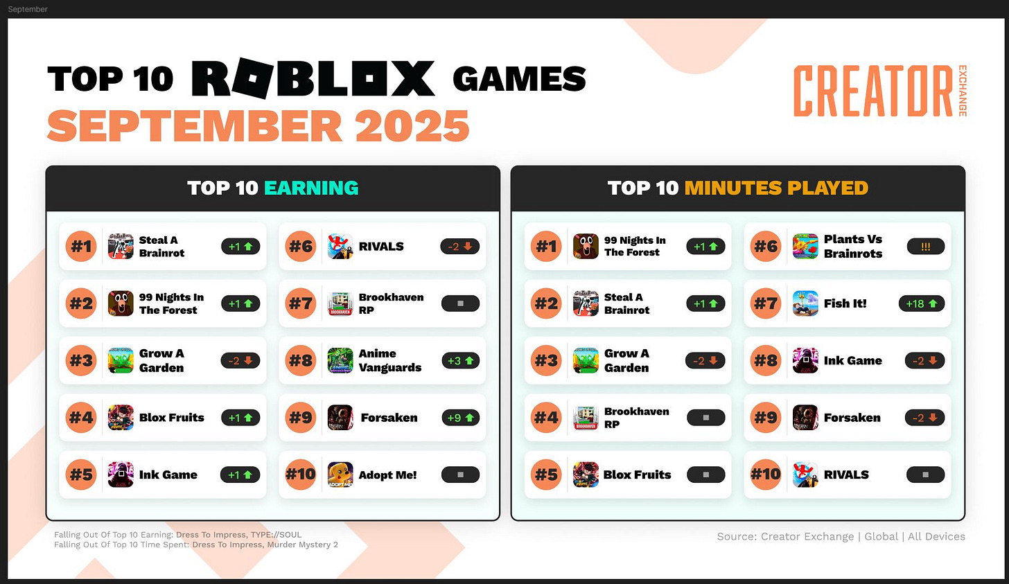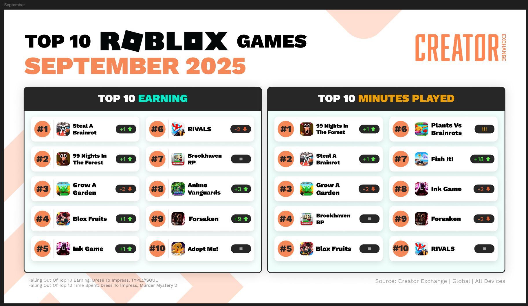 While 99 Nights in the Forest and Steal A Brainrot held their ground for another month, it’s only a matter of time before the tens of millions of players in those games migrate, enabling fresh contenders break into the Top 10.”