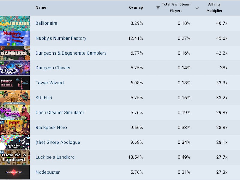 Next, to understand which ‘family’ of PC games CloverPit is most strongly adjacent to, let’s check out GameDiscoverCo Pro data. These ‘Top Affinity’ games have grossed $1-$7m, and only have 5-15% of players in common with CloverPit, but strongly overindex on interest compared to the normal Steam player: