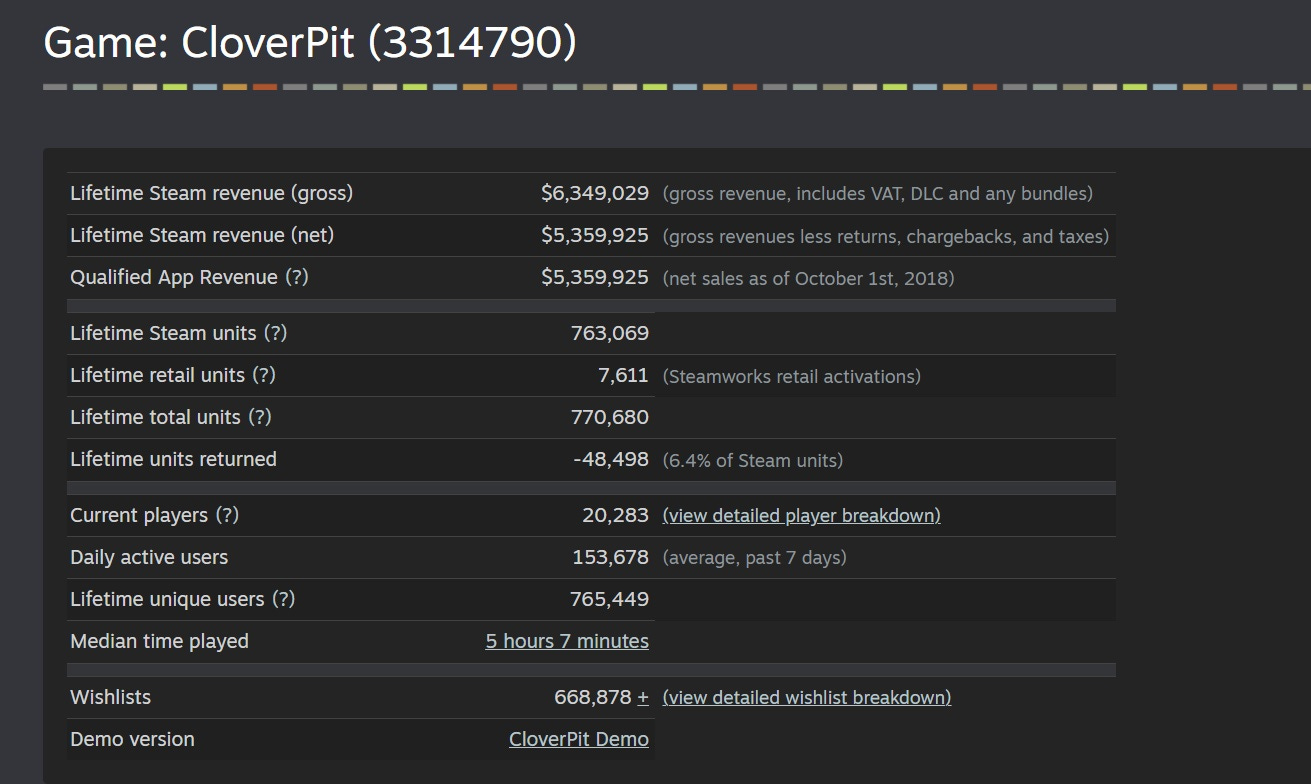 Talking of regional interest, 29% of of the sales of CloverPit so far are in the U.S., followed by Germany (10%), Japan (9%, an over-index), Korea (9%, also over-indexed), China (‘only’ 6%, interestingly), and the Russian Federation, UK and France with 4%.