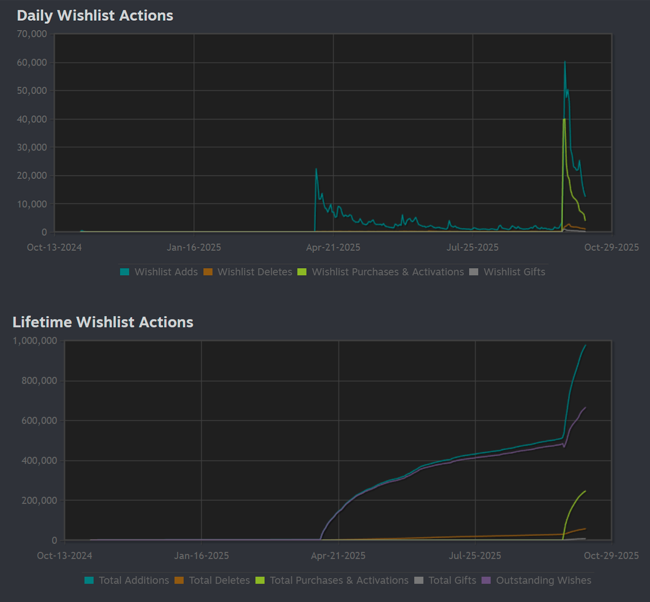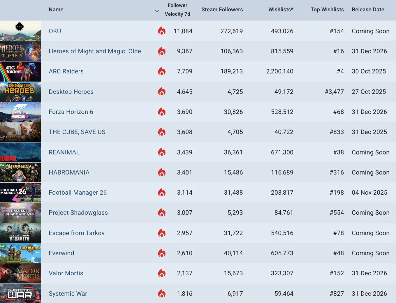 Checking GDCo’s ‘7-day trending’ unreleased Steam game follower chart (Oct 6th to 13th), strategy update Heroes Of Might & Magic: Olden Era vaulted up to #2, thanks to a super-popular demo (24,000 CCU!), followed by Embark’s extraction shooter ARC Raiders (#3) & Tarsier’s spooky Reanimal (#6, new co-op demo.)