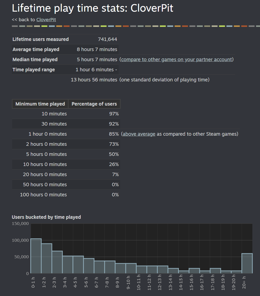 Here’s direct info on the playtimes so far, underscoring that CloverPit is not only purchased a lot, but played a lot. The game’s only been out 2+ weeks, but look: